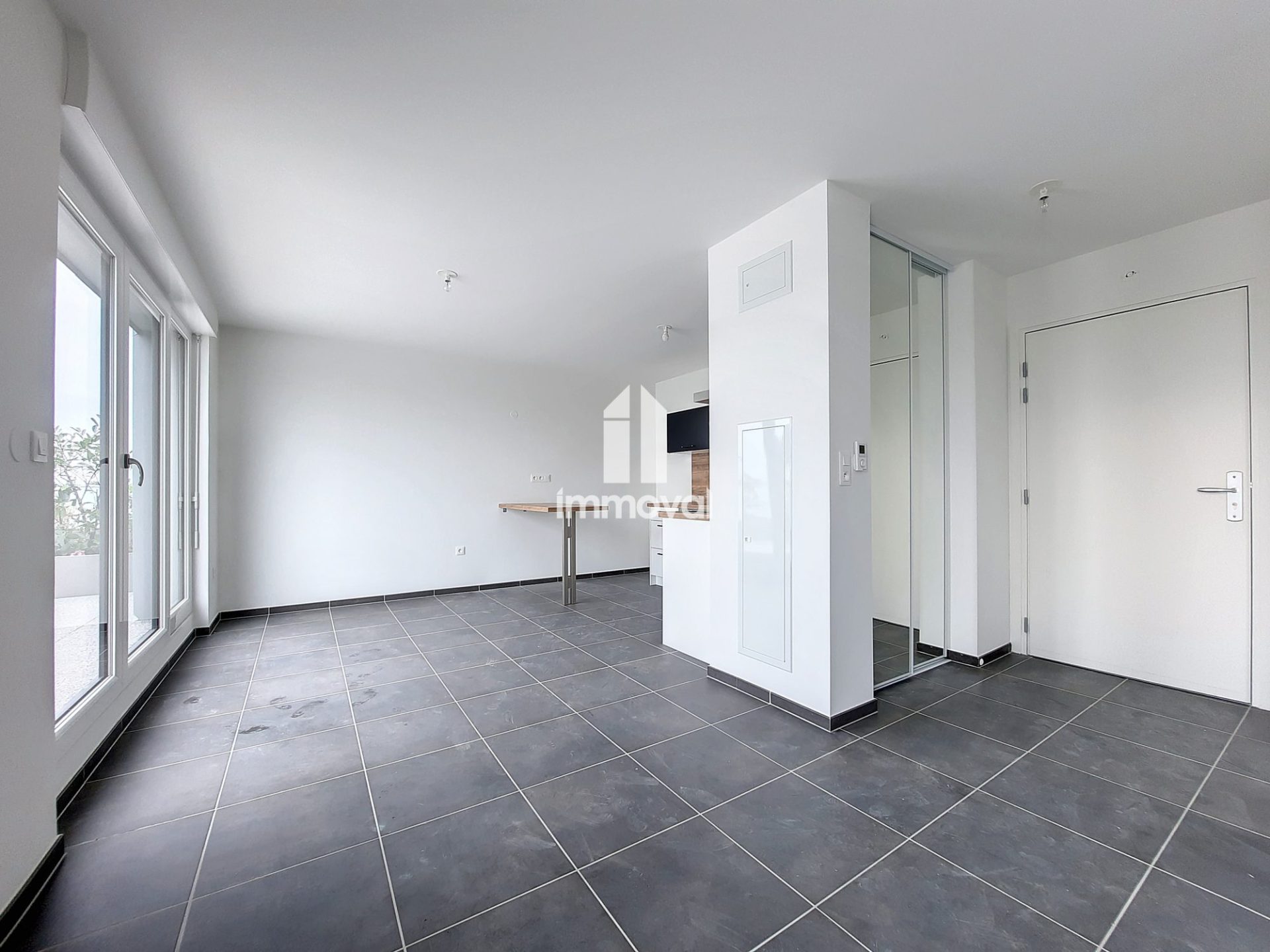 Il se compose d’une entrée, d’un séjour avec cuisine équipée ouverte et d’une chambre ayant toutes deux accès à une grande terrasse, d’une salle d’eau et d’un toilette séparé.