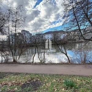 une cuisine, un vaste et lumineux séjour donnant sur l’Ill, une chambre, une salle de bains, un WC et un Dégagement.